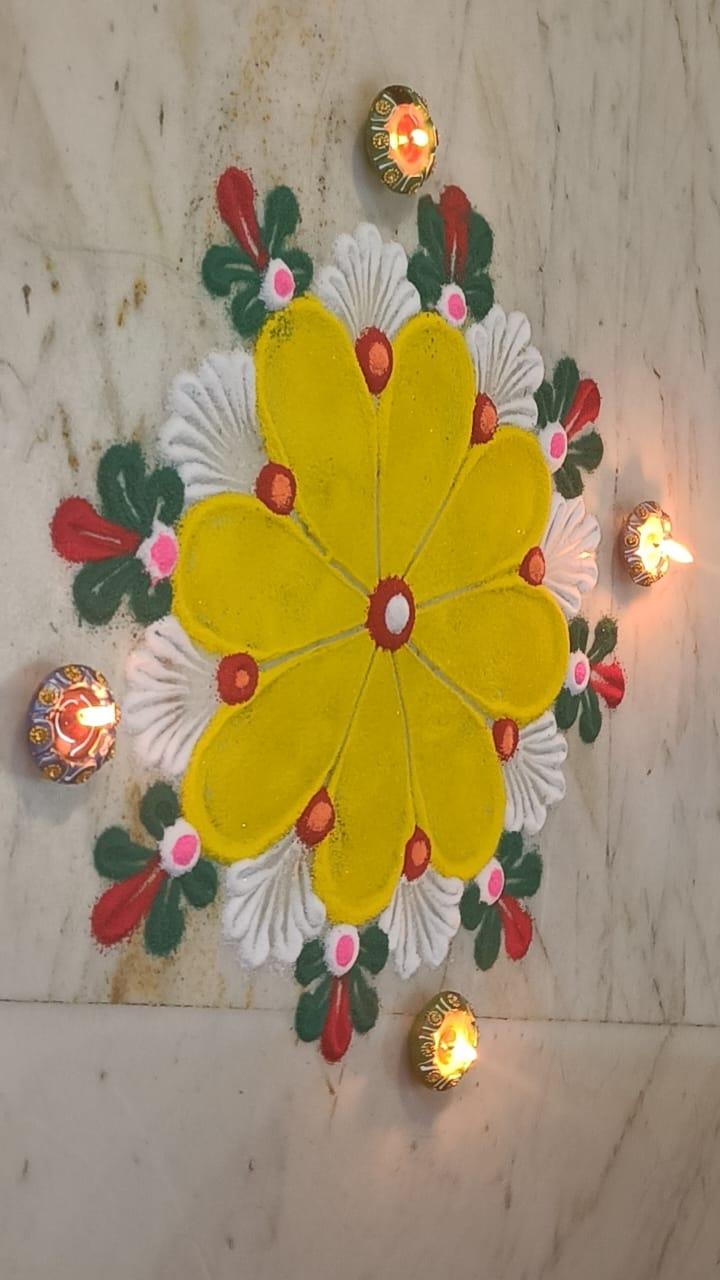 this is yet another vibrant rangoli which i have made and the diyas provide the life to it which makes it appealing and everyone who tries to involve themselves into creative activities like rangoli making it makes them find peace