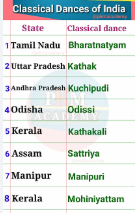 India has eight primary classical dance forms recognized by the Sangeet Natak Akademi: Bharatanatyam (Tamil Nadu), Kathak (North India), Kathakali (Kerala), Kuchipudi (Andhra Pradesh), Manipuri (Manipur), Mohiniyattam (Kerala), Odissi (Odisha), and Sattriya (Assam). The Ministry of Culture also recognizes Chhau, making it nine forms in total, each with distinct origins, styles, and storytelling traditions rooted in ancient texts like the Natya Shastra.