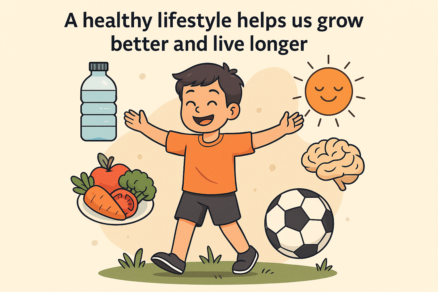 A healthy lifestyle helps us grow better and live longer. When we choose good habits like eating balanced meals, staying active, and keeping clean, our body becomes strong and fit. It also helps our brain stay sharp so we can learn new things easily. Avoiding too much screen time and spending time outdoors keeps us fresh and happy. A healthy life is the key to doing well in school, playing with friends, and enjoying every moment!